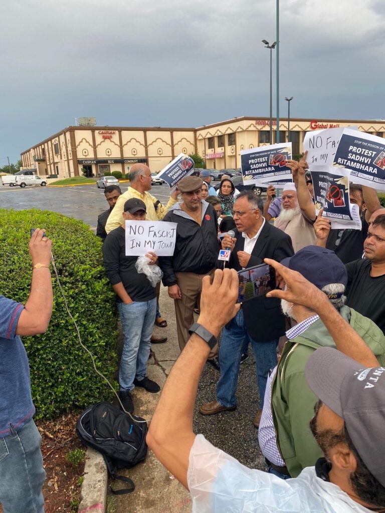 प्रदर्शन को संबोधित करते हुए अमेरिका के सबसे बड़े एडवोकेसी संगठन IAMC अटलांटा चैप्टर के अध्यक्ष ज़मीर ख़ान ने कहा, “यह हर धर्म के अमनपसंद और सभ्य लोगों का अपमान है और इसकी कड़ी से कड़ी निंदा की जानी चाहिए. हम ऋतंभरा जैसे लोगों को अमेरिका के अमनपसंद लोगों के बीच नफ़रत और विभाजन फैलाने की इजाज़त नहीं दे सकते. हम माँग करते हैं कि ग्लोबल मॉल के मालिक और आयोजक इस कार्यक्रम को फ़ौरन रद्द कर दें और अटलांटा के शरीफ़ लोगों से माफ़ी माँगें.”